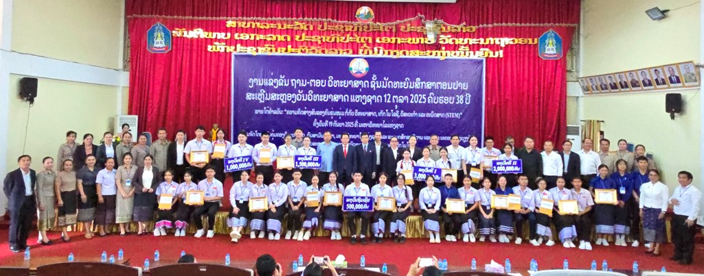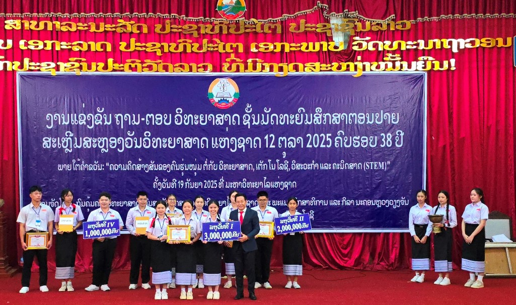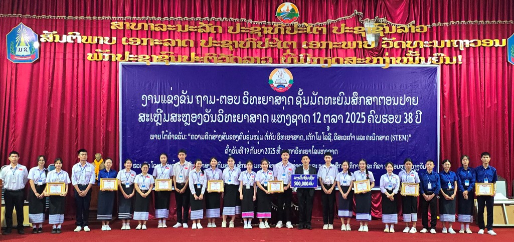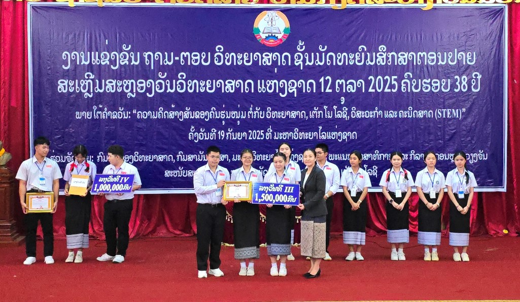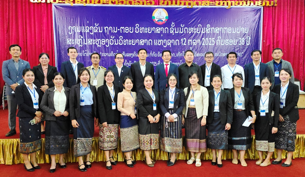 ໃນຕອນເຊົ້າ ຂອງວັນທີ 19 ກັນຍາ 2025 ທີ່ ສະໂມສອນໃຫ່ຍຊັ້ນ 2 ມະຫາວິທະຍາໄລແຫ່ງຊາດ ໄດ້ຈັດງານແຂ່ງຂັນຖາມ-ຕອບວິທະຍາສາດ ຊັ້ນມັດທະຍົມສຶກສາຕອນປາຍ ເພື່ອສະເຫຼີມສະຫຼອງວັນວິທະຍາສາດແຫ່ງຊາດ ປະຈຳປີ 2025 ຄົບຮອບ 38 ປີ ຮ່ວມຈັດໂດຍ ກົມຄຸ້ມຄອງວິທະຍາສາດ, ກົມສາມັນສຶກສາ, ມະຫາວິທະຍາໄລແຫ່ງຊາດ ແລະ ພະແນກສຶກສາທິການ ແລະ ກິລາ ນະຄອນຫຼວງວຽງຈັນ ໂດຍໃຫ້ກຽດເປັນປະທານຮ່ວມ ລະຫວ່າງ ທ່ານ ສຸກສະຫວາດ ສີຫາປັນຍາ ຫົວໜ້າກົມຄຸ້ມວິທະຍາສາດ ກະຊວງສຶກສາທິການ ແລະ ກິລາ ແລະ ທ່ານ ສຈ.ປອ ເດຊານຸລາດ ແສນດວງເດດ ອະທິການບໍດີ ມະຫາວິທະຍາໄລແຫ່ງຊາດ ເຊິ່ງມີແຂກເຂົ້າຮ່ວມ ຈາກຫ້ອງການ, ກົມ, ສະຖາບັນ ພາຍໃນກະຊວງສຶກສາທິການ ແລະ ກິລາ, ສະມາຄົມການສຶກສາພາກເອກະຊົນ, ຄະນະວິຊາຕ່າງໆ ໃນມະຫາວິທະຍາໄລແຫ່ງຊາດ ແລະ ບັນດາໂຮງຮຽນ ທັງພາກລັດ ແລະ ເອກະຊົນ ເຂົ້າຮ່ວມແຂ່ງຂັນໃນຄັ້ງນີ້. ກິດຈະກຳດັ່ງກ່າວ ໄດ້ຮັບການສະໜັບສະໜູນຈາກ ກອງທຶນພັດທະນາວິທະຍາສາດ ແລະ ເຕັກໂນໂລຊີ.